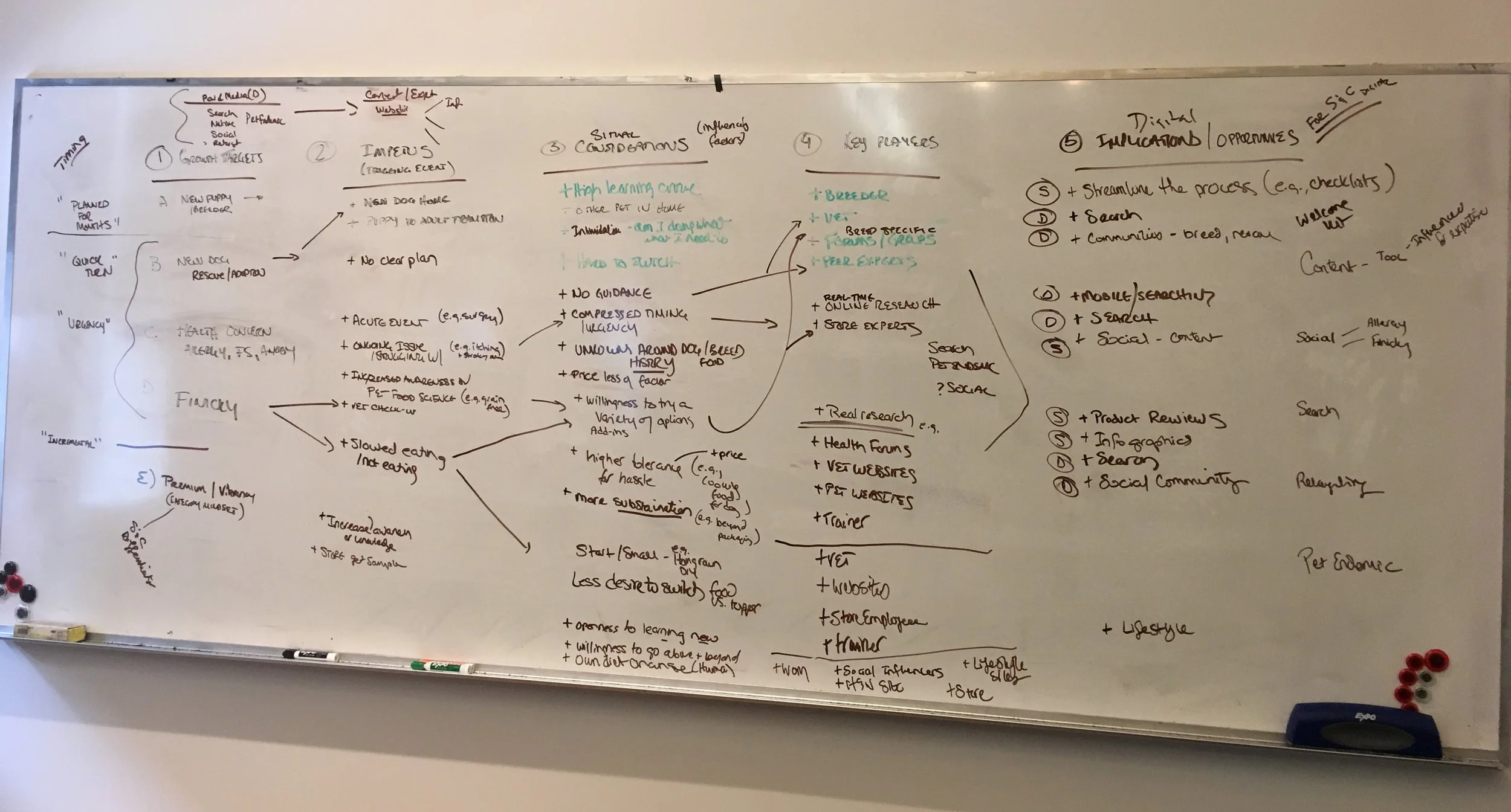 Once I was familiar with the research, I sat down with designers and strategists at Haberman to map out the key pain-points of a dog owner. The white-board below shows potential pathways of the client's customers. Special attention was given to times of uncertainty or high-stress in the journey of the customers. Additional call-outs included intersections between multiple pathways (and the business touch-points associated with them); consequences of these pain-points; and any insights into the culture of different types of customers.