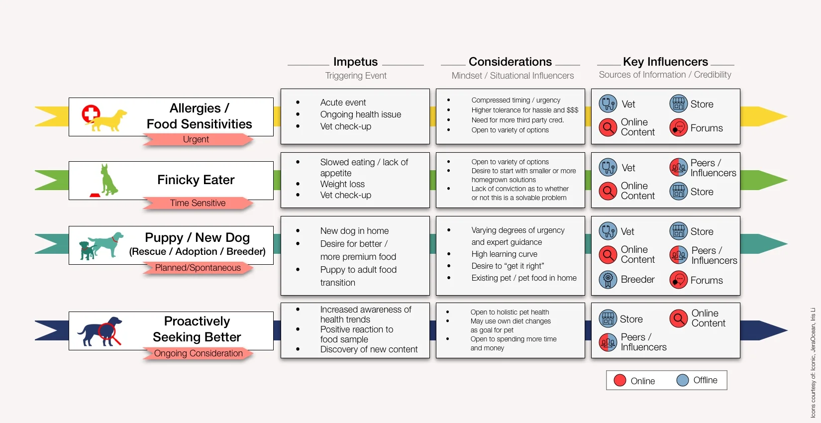 Using Sketch.app, I created a hero document (shown below). This outlines specific types of customers with unique pain-points relating to their dog. The categories are owners with dogs who have food allergies; owners with dogs who are picky eaters; owners who have just adopted a new dog; and owners who are trying to find ways to improve the health of their dog. This document also details the impetus for each type of owner; cultural insights and considerations; and key influencers and information sources.