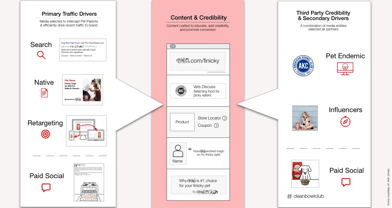 Next, I created a document (shown below) that explained the business implications of the customer pain-points communicated in the hero document. This companion slide showed where there was potential to increase brand awareness and how the client could communicate effectively to dog owners considering a new pet food brand.